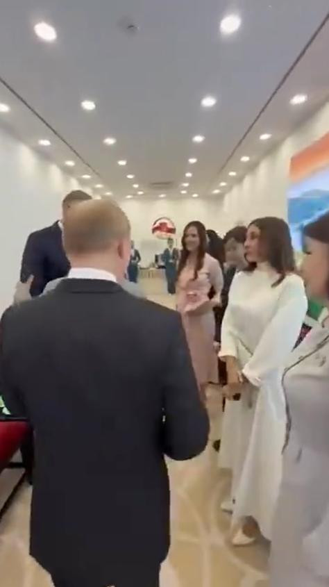 普京见到女眷毫无普大帝的架子,和男士们握手后,又与在场的第一夫人握手问好,恰好塞尔维亚第一夫人穿着的是粉色衣服,站在人群中格外惹眼。